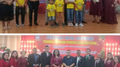 FOTO BERSAMA: Asisten Perekonomian, Effendi Pohan foto bersama dengan Martha Tobing dan anak yatim. Bawah,…