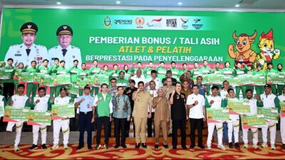 BONUS: Gubernur Sumut M Bobby Afif Nasution foto bersama dengan atlet. MEDAN – Gubernur Sumut…