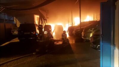 TERBAKAR: Gudang yang terbakar. MEDAN – Satu gudang penyimpanan mobil dan juga dijadikan bengkel di…