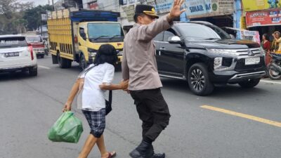 SEBERANGKAN: Kapolsek Pancur Batu Kompol H. Djanuarsa, S.H. saat menyeberangkan seorang warga di Jalan Letjend…