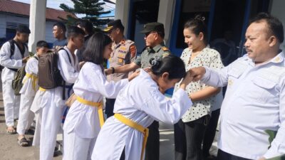 LEPAS: Kapolsek Pancur Batu Kompol Djauarsa S.H., secara resmi melepas kontingen atlet taekwondo Kec. Pancur…