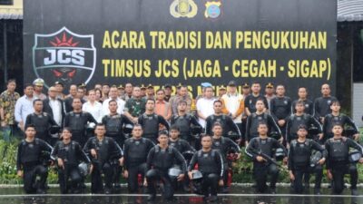 FOTO BERSAMA: Kapolrestabes Medan Kombes Pol Jean Calvijn Simanjuntak foto bersama usai pengukuhan Timsus JCS….