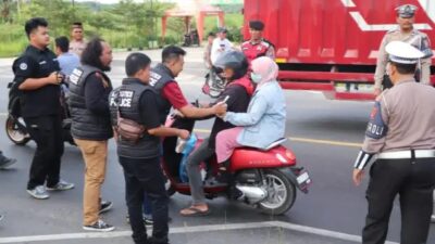 BERIKAN: Personil Polres Sergai saat membagikan takjil kepada pengguna jalan. SERGAI – Polres Serdang Bedagai…