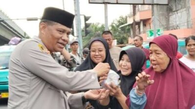 BERIKAN: Kapolsek Patumbak, Kompol Faidir SH, MH saat membagikan takjil kepada warga. MEDAN – Dalam…