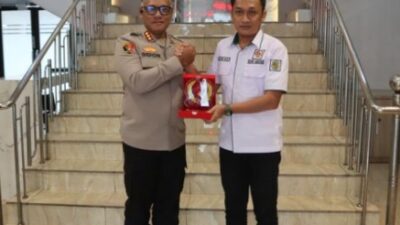 BERIKAN: Ketua KONI Kota Medan Aswindy Fachrizal memberikan cinderamata kepada Kapolrestabes Medan Kombes Pol Gidion…
