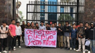 DEMO: Para mahasiswa demo di depan Kantor Dinas Pendidikan Kota Medan MEDAN – Himpunan Pemuda…