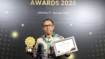TERIMA: Bupati Tapanuli Utara Dr. Jonius Taripar Parsaoran Hutabarat, S.Si., M.Si saat menerima penghargaan. (ist)…