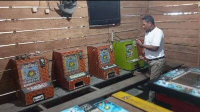 HANCURKAN: Mesin judi saat dihancurkan masyarakat. BELAWAN – Dengan menggandeng tokoh agama, Asli Anak Belawan…
