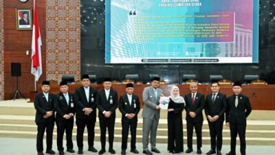 SAMPAIKAN: Gubernur Sumut Muhammad Bobby Afif Nasution menghadiri Rapat Paripurna DPRD Sumut dengan agenda Penyampaian…