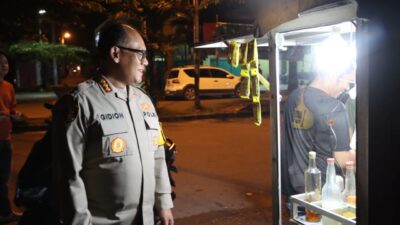 PATROLI: Kapolrestabes Medan Kombes Pol Gidion Arif Setyawan saat dialog dengan penjual jamu. MEDAN –…
