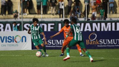 BEREBUT BOLA: Pemain PSMS dan Persiraja saat berebut bola. DELISERDANG – PSMS Medan telan pil…