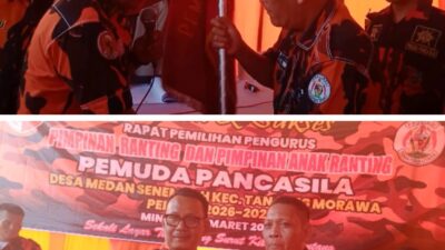 TERIMA: Erwin JF Barus saat menerima pataka dari Ketua PAC PP Kecamatan Tanjung Morawa, Sugiono…