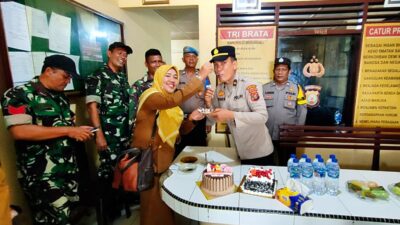 IST/mediamasanews.com TERIMA: Wakapolsek Tanjung Beringin Ipda Brimen Sihotang saat disuapi kue ulang tahun. TANJUNG BERINGIN…