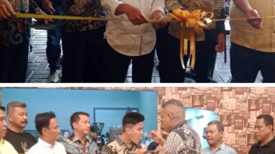 LAUNCHING: Rofi Salim Ramadhan STRIP saat menggunting pita dan menerima nasi tumpeng dari ayahnya, Junaidi….