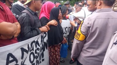 DEMO: Mahasiswa saat demo di Mapolrestabes Medan. MEDAN – Beberapa orang mahasiswa dan keluarga korban…