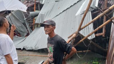 RUSAK: Warga melihat rumahnya yang rusak parah. MEDAN – Hujan deras disertai angin puting beliung dan petir melanda pemukiman…
