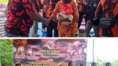 BERIKAN: Junaidi SH saat membagikan daging dan beras kepada warga. Dan foto bersama dengan warga…