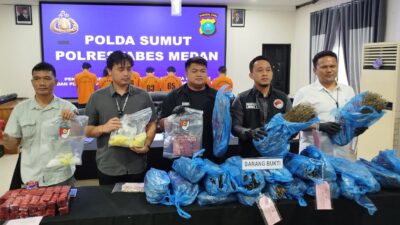 AMANKAN: Wakasat Narkoba Polrestabes Medan, AKP Arham Gusdiar saat menunjukkan barang bukti ganja. MEDAN –…