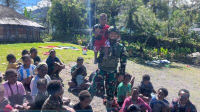 BERIKAN: Personil Satgas Yonif 700/Wira Yudha Cakti (WYC) melalui Pos Kout Sinak melaksanakan kegiatan anjangsana…