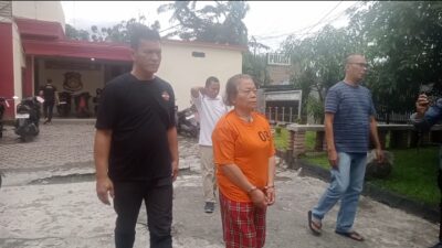 Tiromsi Sitanggang saat digiring petugas ke halaman Polsek Helvetia. MEDAN – Tiromsi Sitanggang (57) ditangkap…