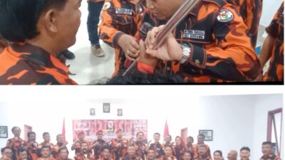 SERAHKAN: Junaidi saat menyerahkan pataka kepada Julianta Barus. Dan bawah, pengurus MPW, MPC dan PAC…