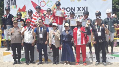 FOTO BERSAMA: Aisha Maydina Hakim dan rekannya foto bersama dengan Ketua Umum Pordasi Pusat. SERGAI…