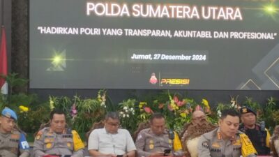 REFLEKSI: Kapoldasu, Irjen Pol Whisnu, Hermawan Februanto saat menyampaikan keterangan Refleksi Akhir Tahun Polda Sumut,…
