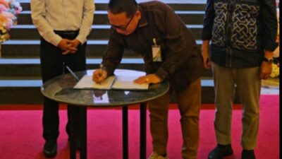 TANDA TANGANI: Kepala Cabang BPJS Ketenagakerjaan Provinsi Gorontalo Sanco Simanullang saat penandatanganan komitmen. (ist) GORONTALO…